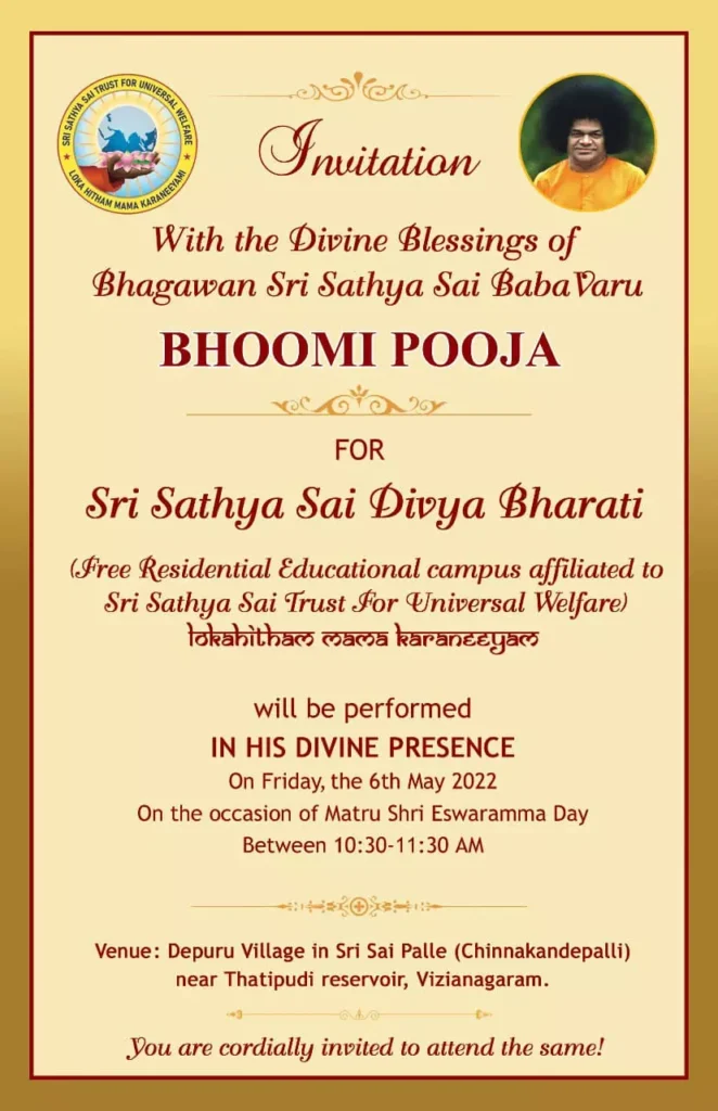 With Bhagwan Sri Sathya Sai Baba’s Blessings, a residential educational campus for girls “Sri Sathya Sai Divya Bharati” will be built in Sri Sai Palle (Chinakhandepalli) near Thatipudi reservoir in Vizianagaram district.