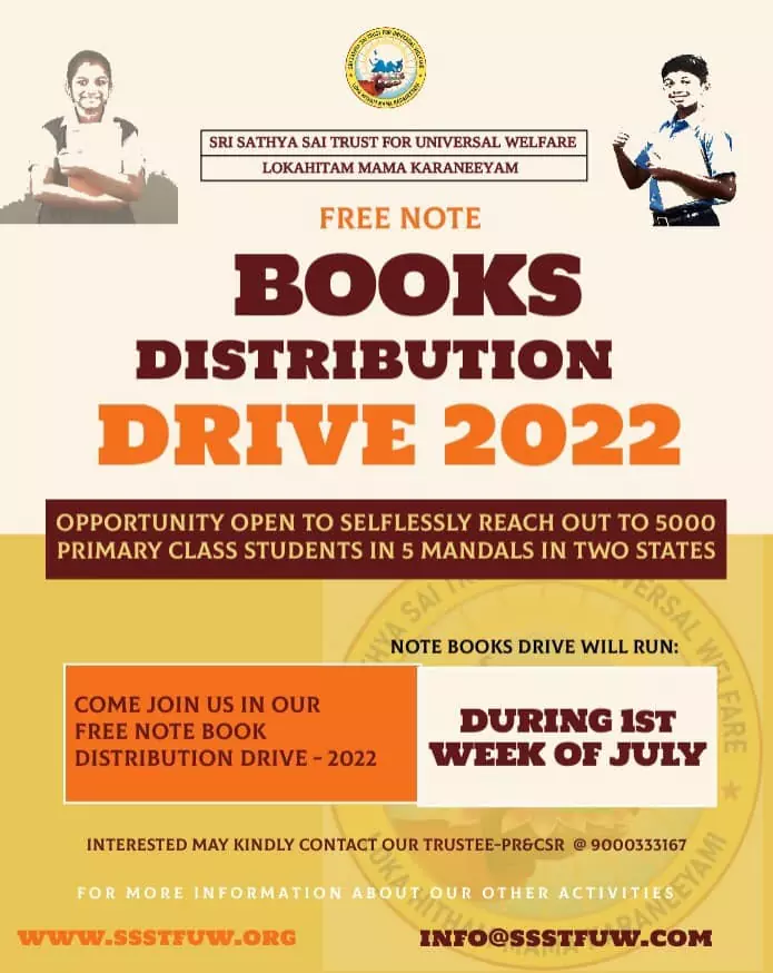 Sri Sathya Sai Trust For Universal Welfare is organizing a mega notebooks distribution drive across 5 mandals in 2 States of AP and Telangana. This drive is an initiative of the Education Wing of the trust that is also engaged in building a free-of-cost residential education campus at Sri Sai Palle (Chinnakhandepalli) near Thatipudi reservoir near Visakhapatnam.